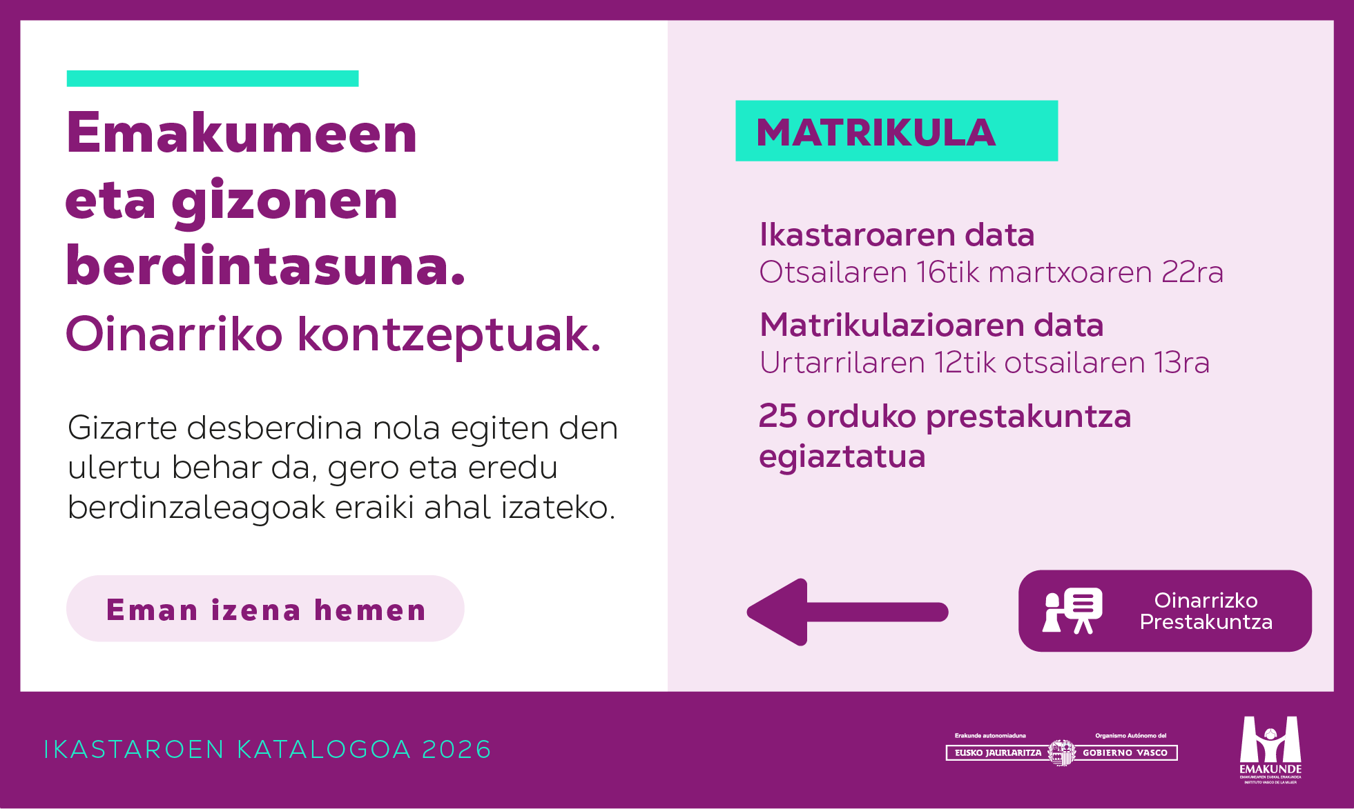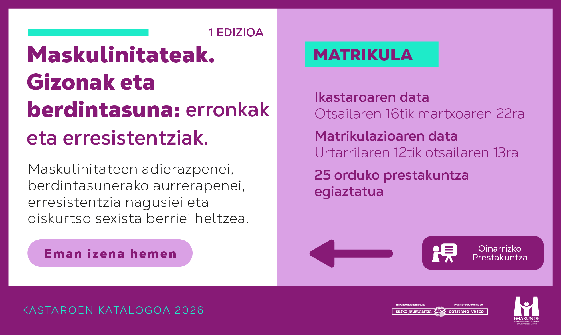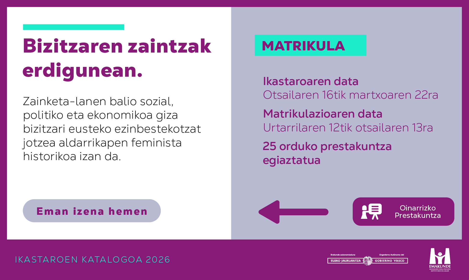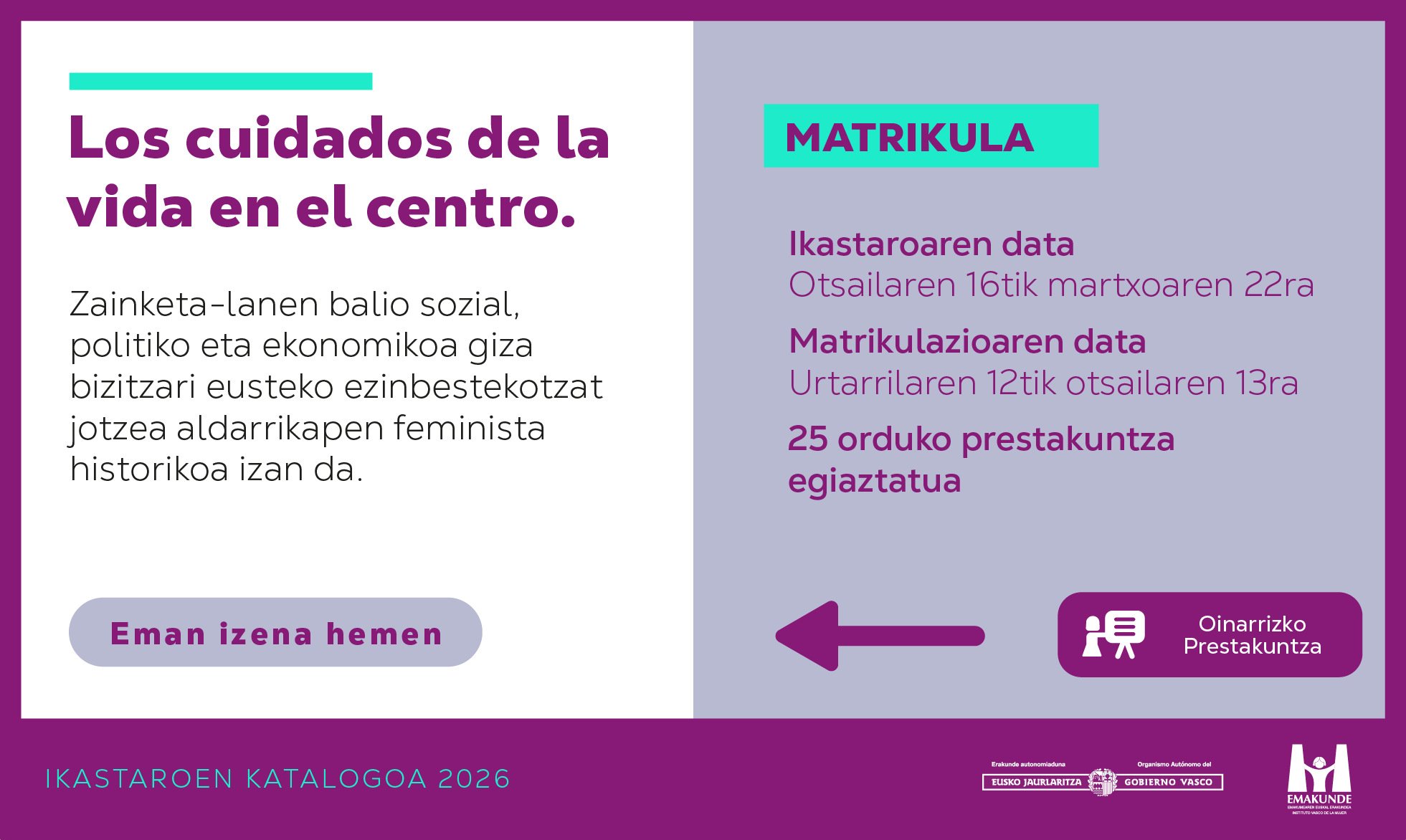 Bizitzaren zaintzak erdigunean Irakasleak: Matxalen Legarreta Iza, Marina Sagaztizabal Emilio-Yus, Alaitz Uriarte Goikoetxea, Maider Barañano Uribarri, Elena Marínez Tola. Matrikulazioa: urtarrilaren 12tik otsailaren 13ra. Ikastaroaren datak: otsailaren 16tik martxoaren 22ra. […]